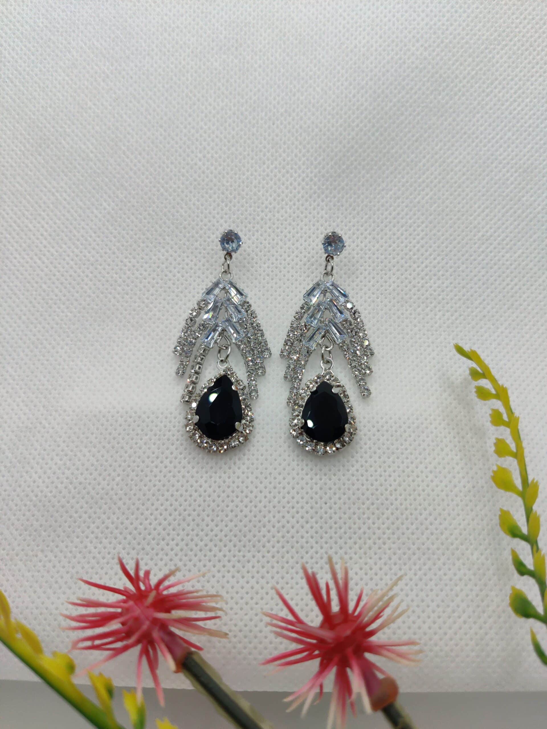 Make a bold statement with these exquisite black teardrop earrings. Designed with a cascading crystal arrangement, these earrings feature a striking black gemstone encased in shimmering accents. The intricate silver-tone detailing adds a touch of sophistication, making them perfect for evening events, formal occasions, or a luxurious touch to any outfit. Lightweight yet glamorous, they are a must-have for those who love refined elegance.