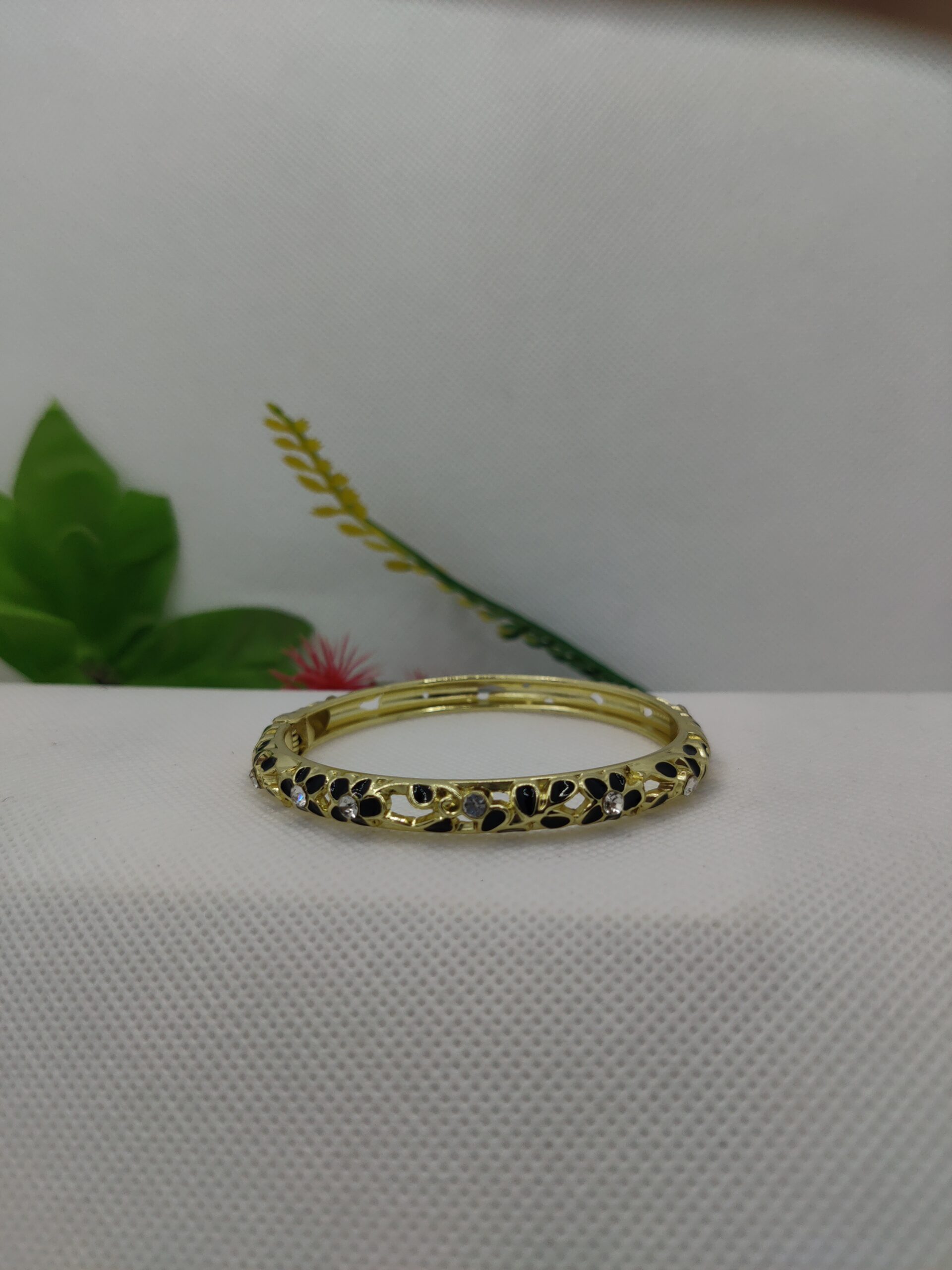 Refined and sophisticated, these gold-toned bangles feature delicate floral cutwork adorned with sparkling embellishments. Designed for modern elegance with a traditional touch, they are perfect for special occasions, festivities, or adding a hint of glamour to everyday wear. A timeless addition to your jewelry collection