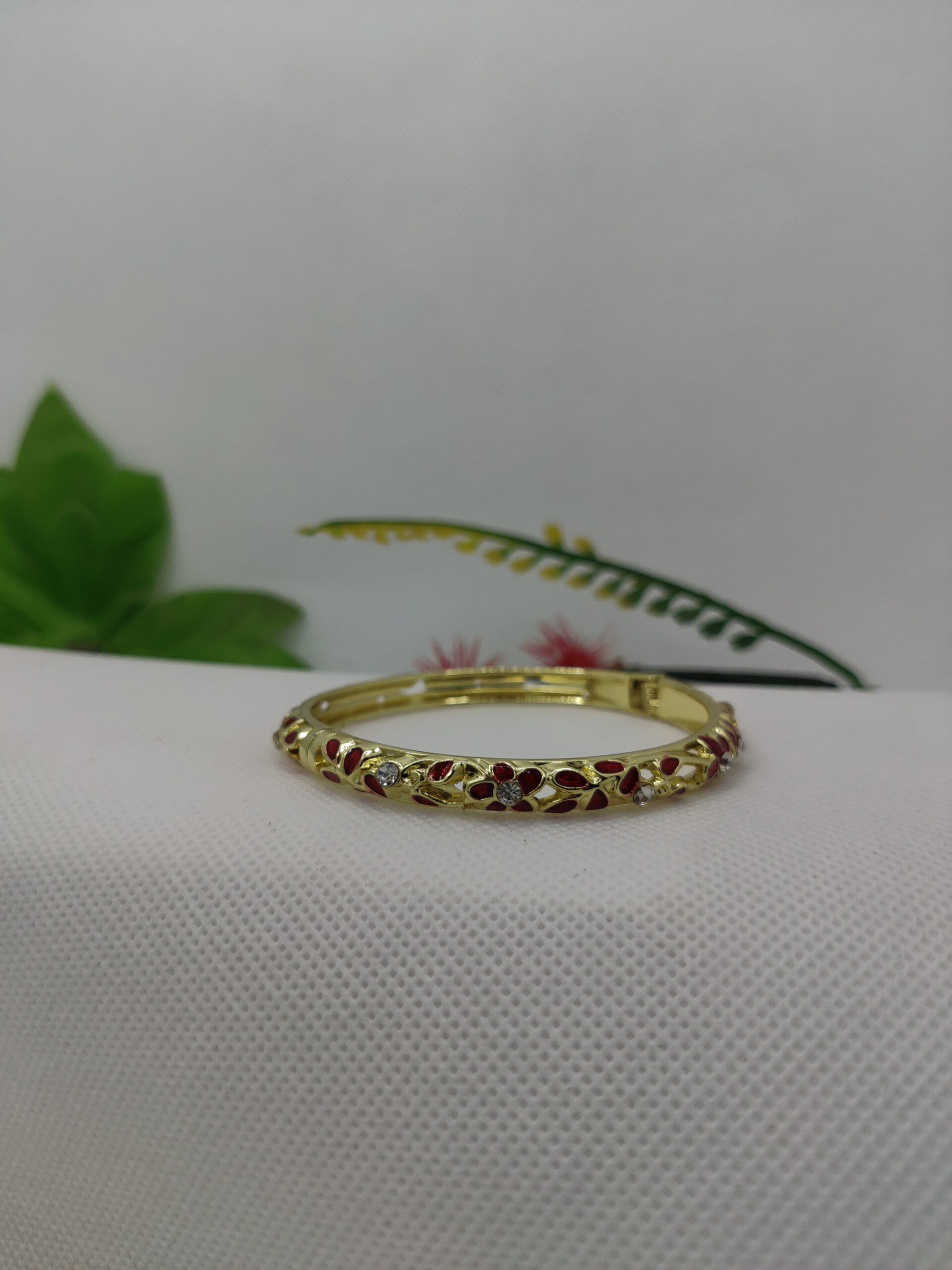 Add a touch of timeless grace to your ensemble with these exquisite gold-toned bangles. Featuring intricate detailing with red and white embellishments, these bangles are perfect for elevating both traditional and contemporary looks. A must-have accessory for festive occasions, weddings, or elegant evening wear.