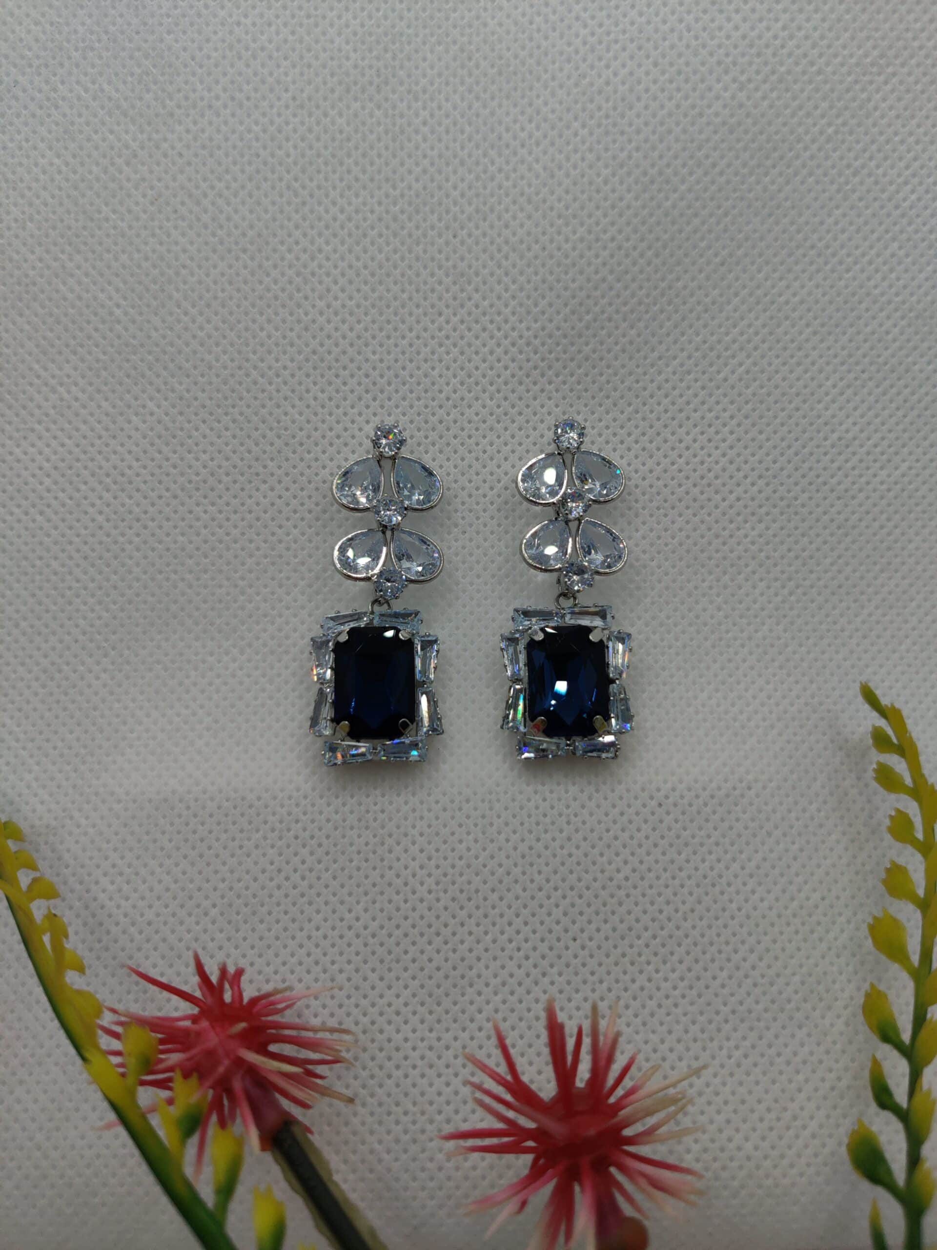 Add a touch of regal elegance to your look with these stunning royal blue crystal drop earrings. Featuring a sophisticated combination of clear teardrop accents and a bold, deep blue rectangular gemstone, these earrings are designed to exude luxury. The silver-tone frame enhances their brilliance, making them perfect for formal events, evening wear, or any occasion that calls for a refined statement piece.